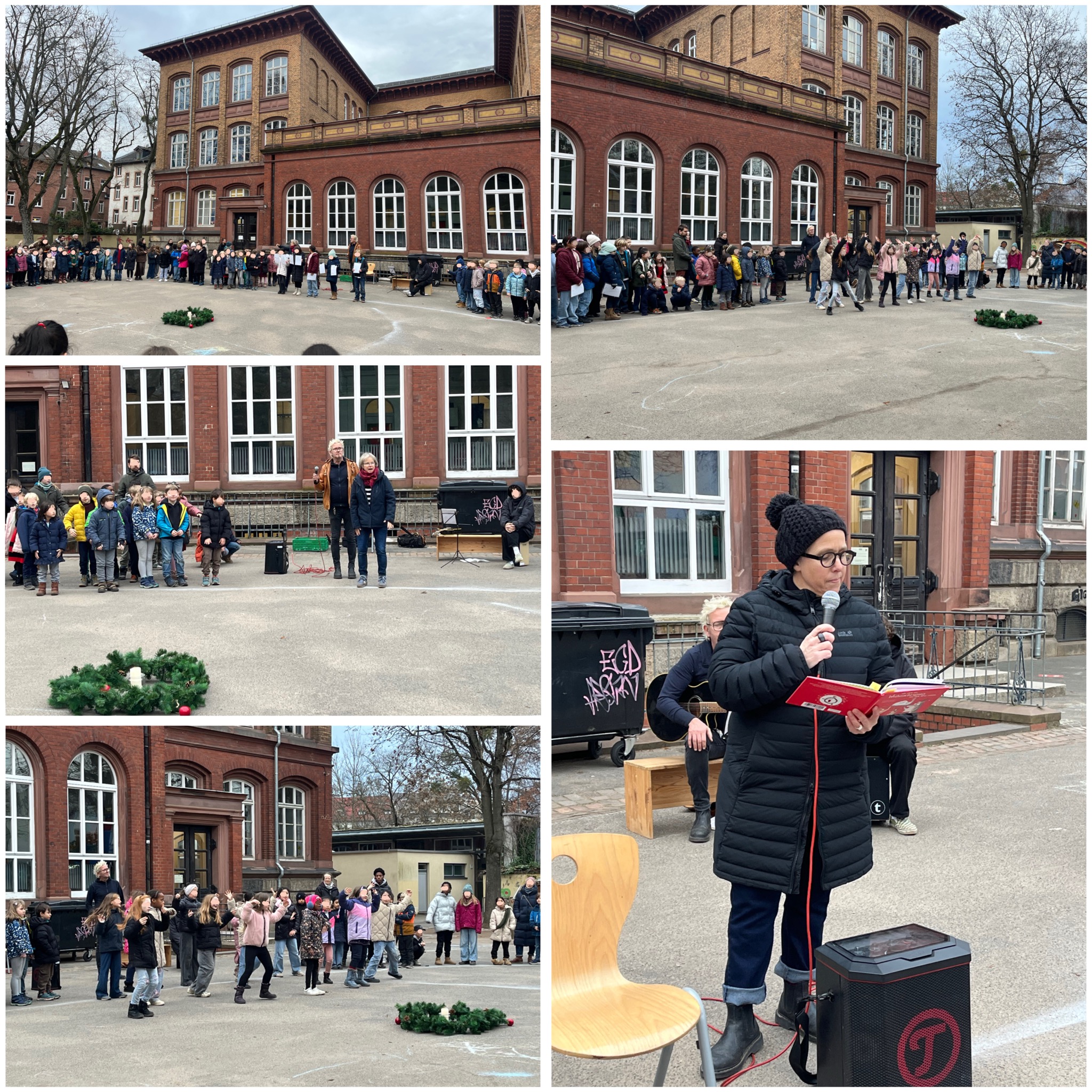 Wie jedes Jahr am letzten Schultag vor den Weihnachtsferien, fand auch in diesem Jahr wieder unser Weihnachtsritual statt. Jeder Jahrgang hat ein eingeübtes Lied gesungen und es gab Vorführungen von einzelnen Gruppen. Dazwischen wurde eine Weihnachtsgeschichte vorgelesen. Zum Schluss haben wir alle gemeinsam noch gesungen und eine Weihnachts-Body-Percussion von Frau Hübner gelernt.