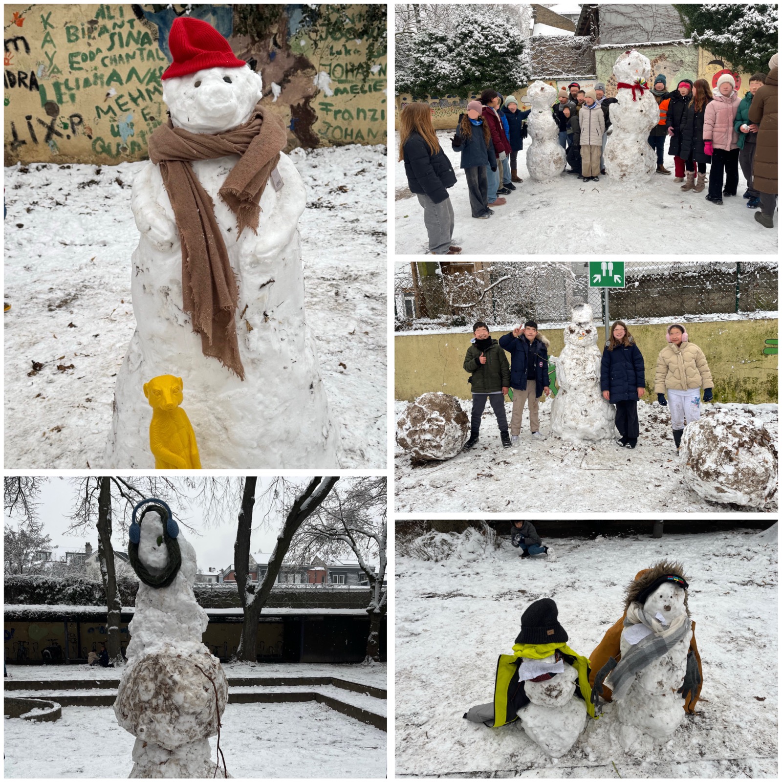 Es schneit! Juchuh! Schneebälle werfen sind aber verboten! Wir bauen lieber Schneemänner. Die schönsten Schneemänner wurden prämiert.