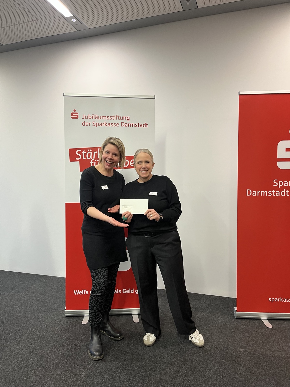 Die Goetheschule erhält für 2 Projekte über die Jubiläumsstiftung der Sparkasse Darmstadt zwei Projekte gesponsert: Die Gestaltung der Friedensbrücke der Streitschlichter AG mit dem Künstler Jörn Heilmann auf dem Schulhof und das Kinder-stark-mach-Projekt für Jahrgang 1 / E2. Frau Nebhuth und Frau Britz sind bei der Preisverleihung.